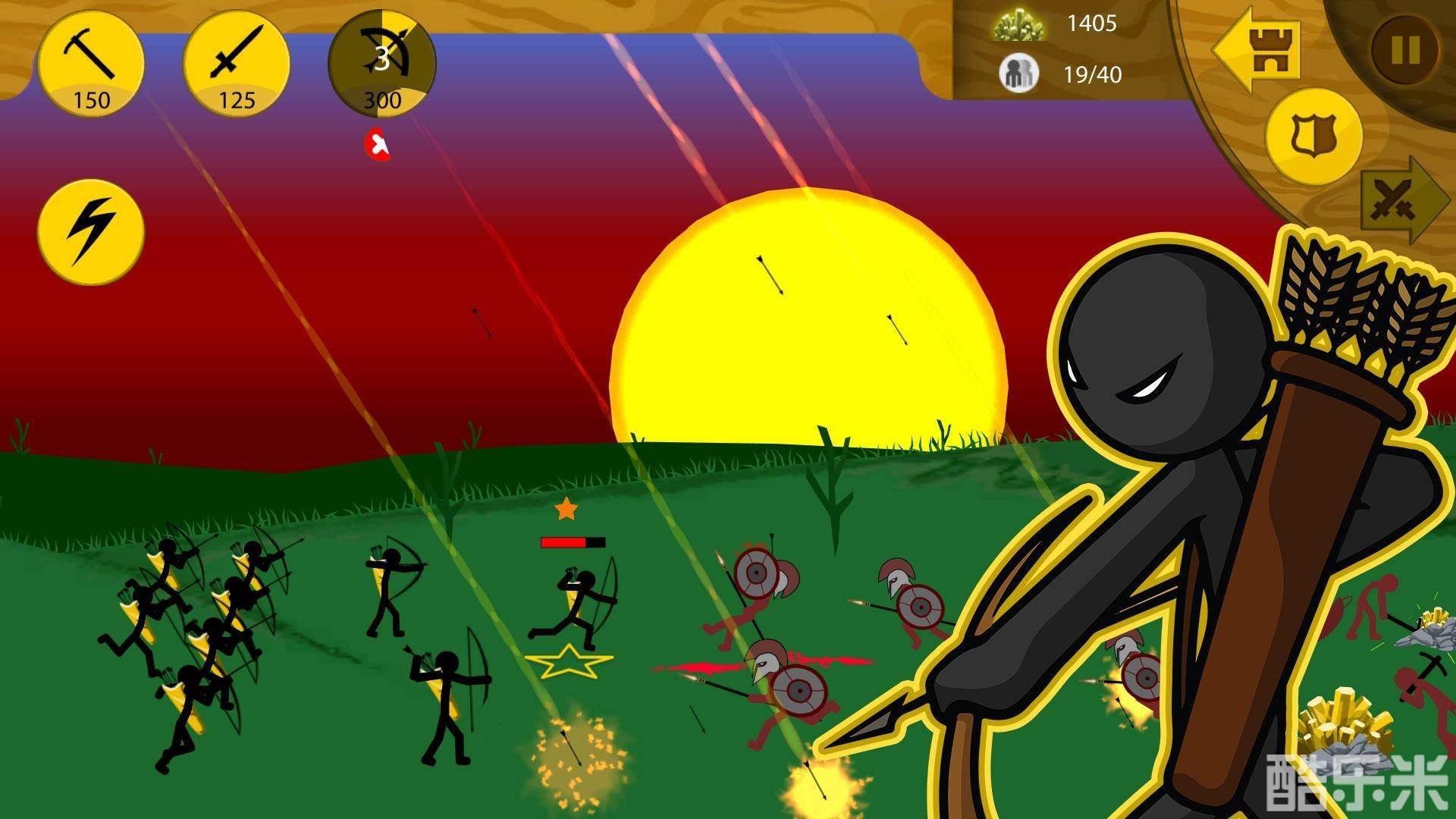电脑(仅在运动模式)的巨人只会傻乎乎的攻击面前的单位,不会强推基地,这时,你可以用一个剑士在巨人前后面防御着乱跑(防御着减血少),从而有足够的时间建立大部队。用此方法,也可以用弓箭手攻击