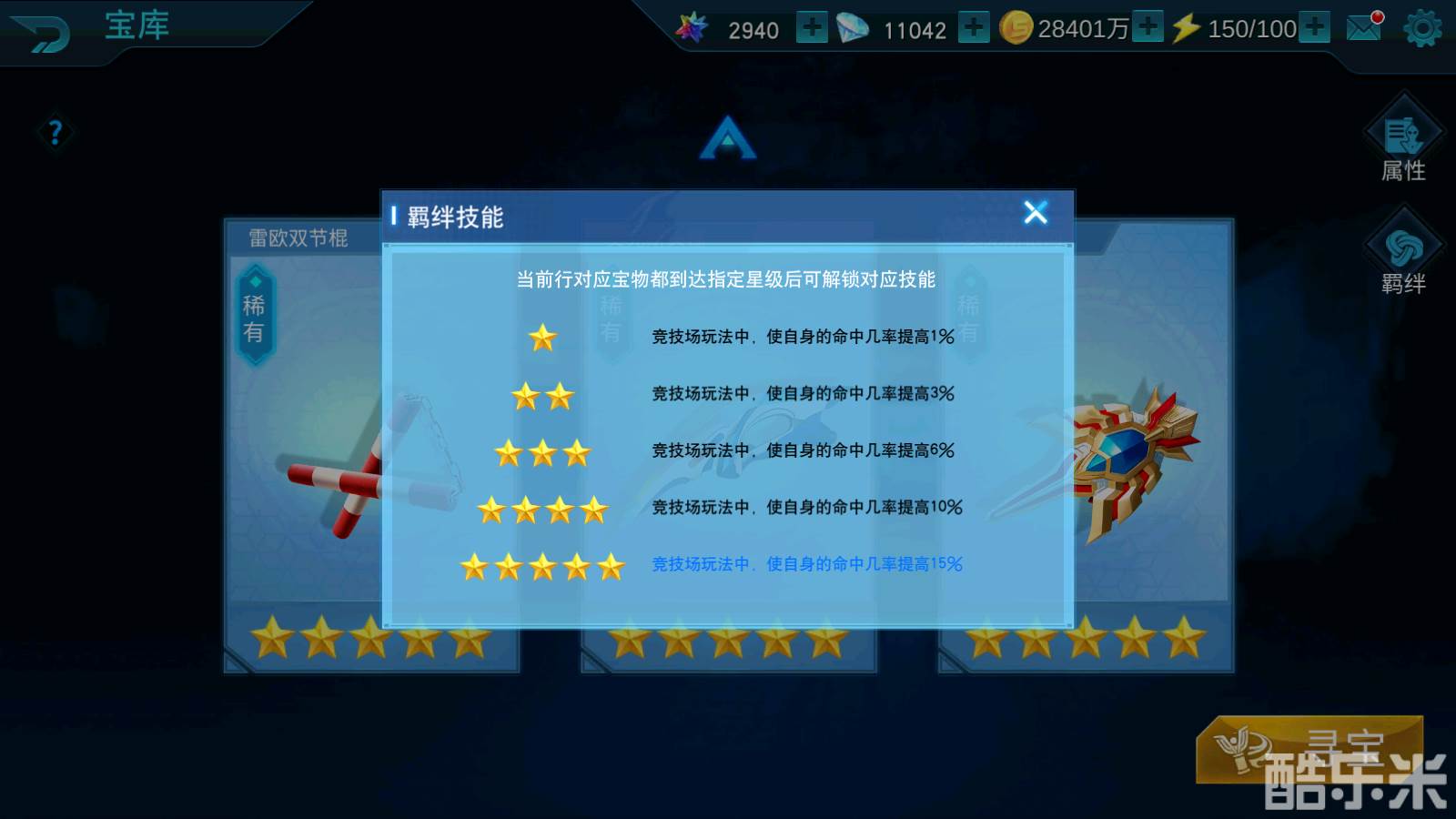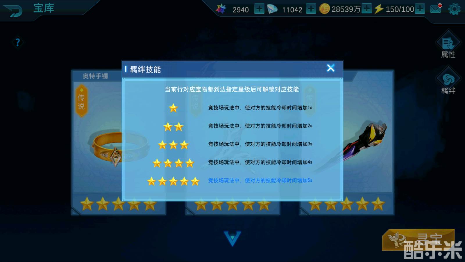 奥特宝库系统需要玩家通关普通复本3-2后可以解锁,每日均可获取一次免费召唤的机会;每月可获取一次10连免费召唤的机会,每次抽取均有概率获得传说级神器碎片以及特殊的希卡利强化器。消耗对应的神器碎片和希卡利强化器可以提高神器的星级,当一组神器均达到指定星级时,即可解锁对应的羁绊效果,例如当玩家收集齐全套的雷欧双截棍、麦克斯银河和艾克斯头镖,即可在竞技场中激活特殊效果:提高自身15%的命中率。