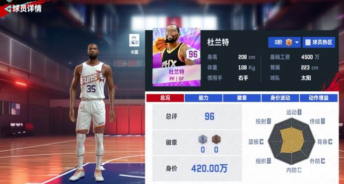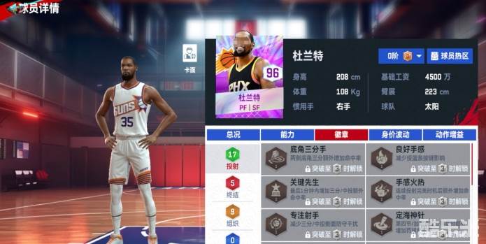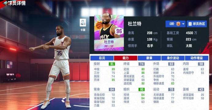 杜兰特不仅投篮出色,还具备很强的突破能力,玩家可以利用自己的速度和变向技巧,去突破防线攻击篮筐。此外,他的专属技能和动作,比如专属后仰投篮等,进一步丰富了他的进攻选择,提升了在不同情况下的得分效率。满突之后的杜兰特拥有9个组织徽章,这使得他具备很强的组织进攻能力,能够在进攻中为队友创造机会,起到串联球队的作用。