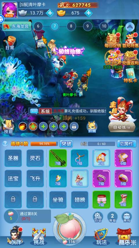 4、游戏还有个修仙系统,在线挂机就可以自动获得灵气值,达到100%就可以突破,前期只要可以突破就去突破就好了,突破后可以提升属性,想快速提升的话可以购买灵气礼包。