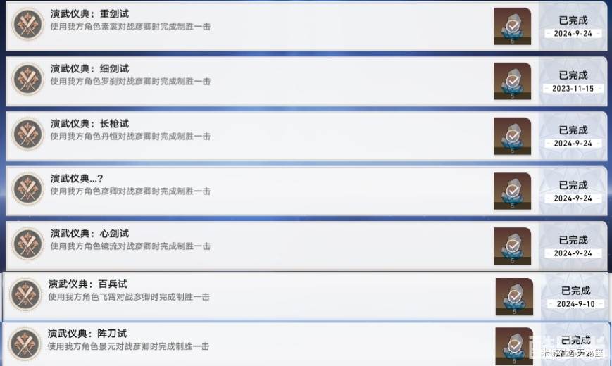 也分别对应七个成就:重剑、细剑、长枪、?、心剑、百兵、阵刀