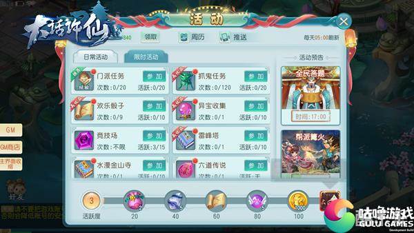 到了20级,游戏功能开放和玩法就多种多样了。玩家可以继续任务流,也可以通过抓鬼去提升等级,建议根据日常活动去完成各种活动,一方面可以获得升级所需要的经验和各类道具奖励,另外还能获取活跃度领取奖励。