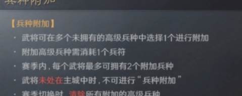 在S3赛季中,武将可在多个未拥有的高级兵种中选择一个进行附加,附加需要消耗兵符,每个武将最多拥有2个附加兵种,且附加兵种赛季内无法更改。