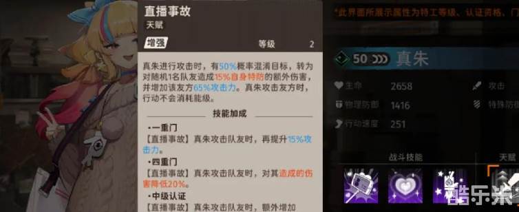 ”互动环节”是她的大招,也就是超限技,技能效果也比较简单粗暴,选定敌人后可以对敌方造成339.98%的特殊伤害。重点其实还是她的天赋效果”直播事故”,能够对角色的能力进一步的增强。