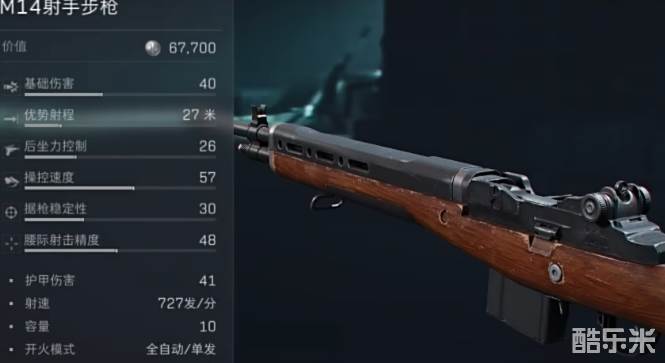M14是一把射击步枪,这把步枪的型号算是比较老的,本身的基础数据是非常优秀的。首先第一个优势的点是射程伤害,这把武器的射程有27米,基础伤害则有40,在步枪之中这个距离和伤害都是非常可观的。同时此枪的攻速非常快,在步枪的基础版本之中算是比较突出的一把枪械了。