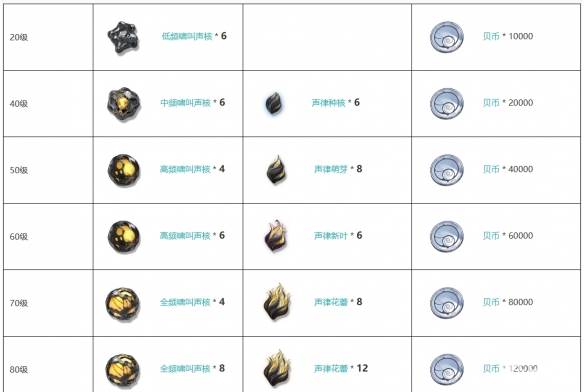 初始 / 20 / 40 / 50 / 60 / 70 / 80 / 90级: