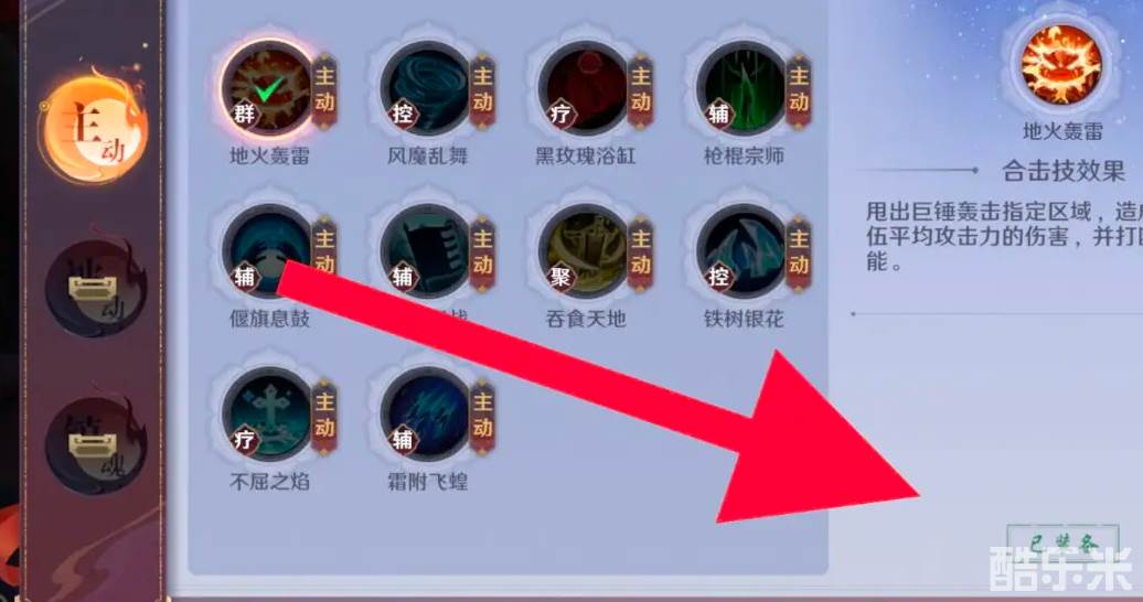 2、当玩家成功进入主动技界面后,选择要装备的合击技