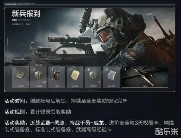 奖励:近战武器-黑鹰、特战干员-威龙、进阶安全箱3天权限卡、精锐制式装备券、标准制式装备券、武器高级经验卡