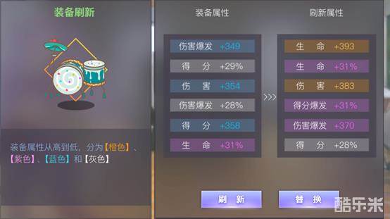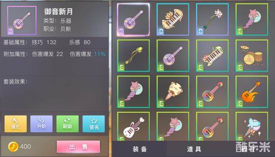 在装备附加属性的选择上,吉他和贝斯选择防御类;主唱选择得分或者伤害类、键盘和鼓手选择得分或者伤害类;和声则可根据团队需要或者特定社员来选择是防御还是输出。另外优先选择百分比加成,因为越到后期百分比加成越明显。