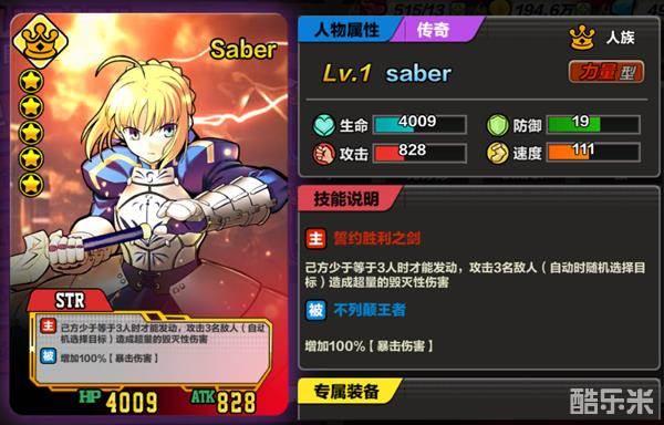 放在前排当肉盾的saber可以承受住很强的打击,主动技能的触发条件又让saber在残局的识货爆发出可怕的输出伤害,如果搭配治疗角色的话,saber经常能出现1打N的反杀效果。所以推荐把saber放在前排中间的位置,用来承担敌人的主要伤害。装备建议玩家尽早把saber的专属装备找到,有了专属武器的saber更是如虎添翼。