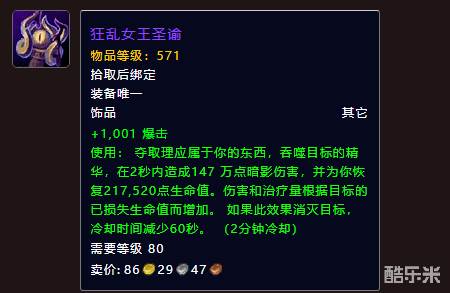 魔兽世界的11.0版本终于正式上线了,小伙伴可以重新回国服体验游戏了,这次更新带来了全新的职业玩法,那么有不少小伙伴好奇奇袭贼饰品选什么,下面酷乐米小编给大家带来魔兽世界11.0奇袭贼饰品推荐。