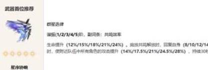 五星专武「星序协响」:作为守岸人的专属五星武器,「星序协响」提供了治疗效果加成、协奏能量回复和全队暴击率提升的效果,是守岸人最佳的武器选择。通过该武器,守岸人能够在战斗中更频繁地释放技能,为队伍提供持续的增益和治疗。