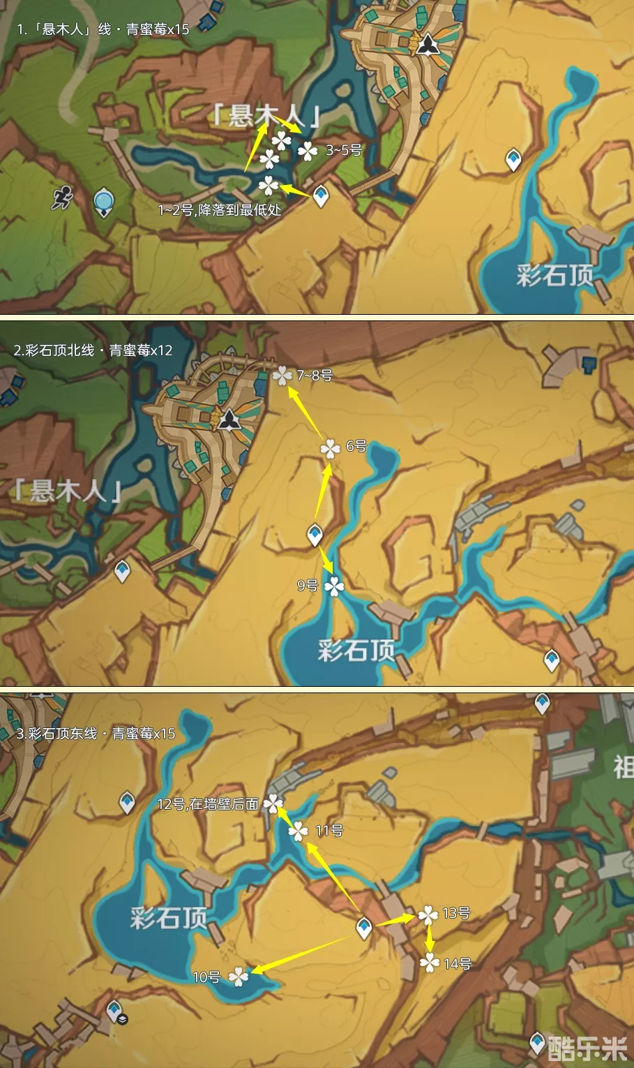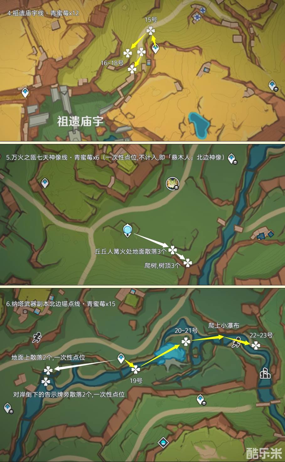 青蜜莓点位仅分布在纳塔「万火之瓯」和「踞石山」区域,其中可重复采集数量为27株(每株有3个,总共有81个),一次性采集有10个。制作路线时尽量遵循从上往下游,视野高好看清,方便旅行者探索。