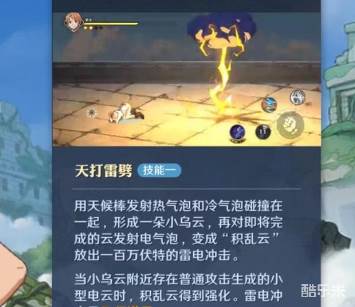 第1个主动技能是天打雷劈,天候棒可以发射出冷气泡和热气泡,触碰到一起形成小朵乌云,再对即将完成的云发射电气泡,就可以变成积乱云,放出100伏特的雷电冲击。当小乌云附近存在普通攻击生成的小型电云时,积乱云还能获得强化。这个技能使用需要一定的过程,大家一定要找好释放的时机,生成的雷电冲击威力还是很大的。
