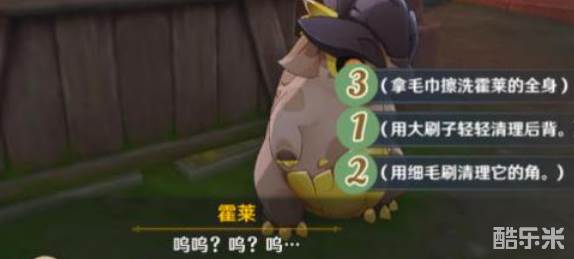 前三步先按照NPC提出的顺序来选择:『清理后背』→『清理角』→『擦洗全身』(选项②③①),在第四步应不按照他的要求,而是反复选择『摸摸肚子』『捏捏手』,任意选三次。