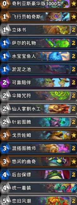 上周还说萨满是花样最多的职业,奇利亚斯被削弱了,这下好了,萨满全没了。进化萨还是推荐季岁的那套。起手找牌:飞行员帕奇斯,水宝宝鱼人,奇利亚斯,戈贡佐姆,伞降护符,立体书。