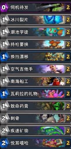 没想到元素贼被砍死之后,盗贼竟然更厉害了,这要得益于最近护符贼的开发,思路太多了卡组都挑花眼了。这套武器护符贼glory和reqvam都玩过,目前在欧服前50,胜率很高,但是确实是新卡组,还需要一点时间验证。起手找牌:刀剑保养师,悦耳嘻哈,疾速矿锄,换挡漂移,潮池学徒,闭麦收工。