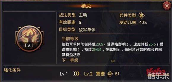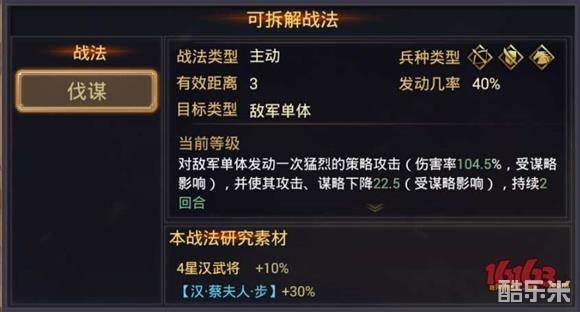 LV10 40%几率 210%伤害[受谋略影响]~ 并使其攻击,谋略下降22.5[受谋略影响]~持续2回合
