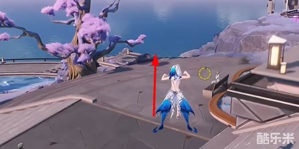 3、从这个粉色的树旁边过去直接跳下悬崖就可以看到了。