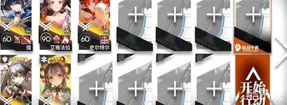 2、站位选择:将煌放在右侧第1个格子,蓝莓放在第三排右侧,其他角色的位置如下图所示。