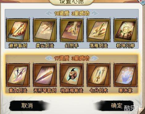 心愿配置:辟邪、乾坤必要,柔云、幻阴防守,落雁输出,七分、素女保证输出,琴剑、缩骨、寒冰掌都可以看情况换,心愿抽多了,17资是迟早会溢出的。