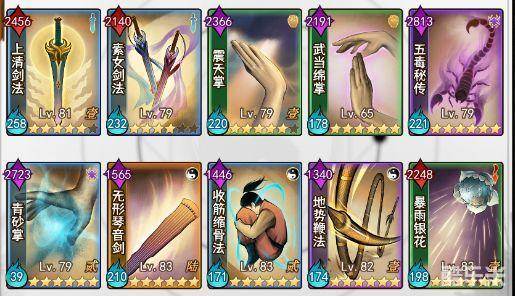 卡组内武功大部分都可以扫荡精英副本、新区活动免费获取。利用上清+素女+暴雨针给对方频繁造成兵刃外伤的同时,暴雨针还可以给对方牌库生成废牌,输出利用震天掌的痛内触发武当的减内,前期输出可以主要升级进阶这几个武功。