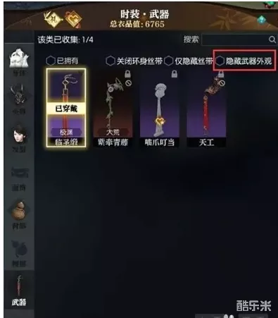 点进去以后我们会来到服装武器页面,找到最右边的隐藏武器外观,将其勾选起来即可。如果你想重新显示武器,只需按照相同的步骤,再次点击“武器”按钮即可开启显示。