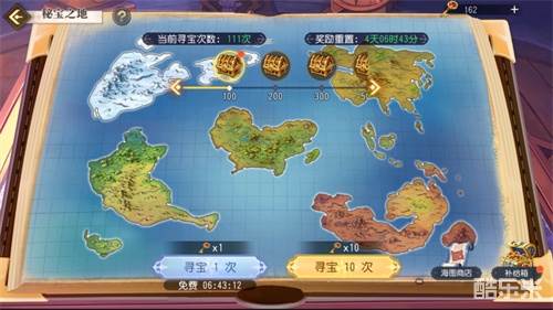 2.进入秘宝之地,可消耗“宝藏钥匙”进行寻宝,获得岛屿、指南针、海图线索(岛屿升级材料)和海图币。当寻宝到达指定次数,可点亮宝箱获取额外奖励。(请留意重置时间)。