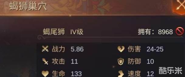 蝎尾狮是地下城种族的初级兵种,领主大人们升级4级主城后即可解锁。蝎尾狮作为机动兵种,其生命,速度都比较高,是游戏前期比较优秀的中排兵种。