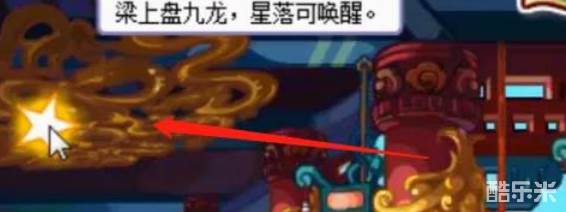 将星星移动到左上角的龙纹吊顶处,页面会显示:梁上盘九龙,星落可唤醒。