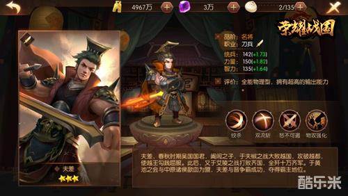 《荣耀战国》中,夫差作为武将,属于全能物理型,拥有超高输出能力。四大技能为绞杀、双流斩、怒不可遏、物攻强化,技能均可升级。