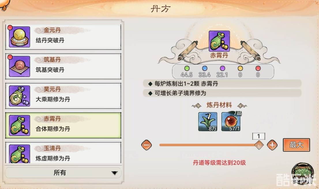 炼制丹药对弟子的炼丹等级也是有很大影响的。比如需要我们的弟子炼丹等级达到20级,才能够炼制【赤霄丹】;
