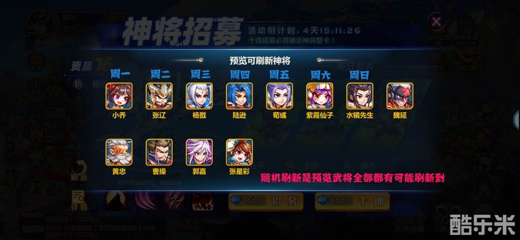 游戏中神将招募刷新规律是什么样的呢,很多新手玩家并不知道神将的具体招募规律是什么,那么接下来酷乐米小编来给大家具体介绍一下游戏中神将的具体招募刷新时间。