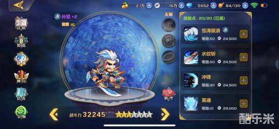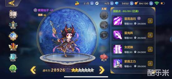 2、紫霞:16资质的神将,能打能抗,我用来当做福坦了,队伍的最高输出,经常一个大招干死对面前排(紫霞开大的时候对面前排基本半血左右),一定要有水属性,不然打人不疼。紫霞二技能是核心技能,控制对面智力武将,一般智力武将都是输出和奶,基本第一个控制完可以连上第二个,好几秒不能动,很好的控制对面输出。三技能紫霞的神技,时间越长攻击越高,观察了好几次,孙坚打对面700血的时间,紫霞一个平A要在2100左右了,非常强劲。紫霞4技能比较平常和孙坚一样加物理防御,增加生存时间,打出更高输出。