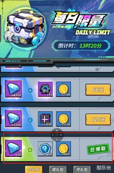 ⑤每日特惠。每日特惠分为日礼包、周礼包、月礼包,每种礼包都有一个免费的礼包,礼包的冷却时间都不一样。