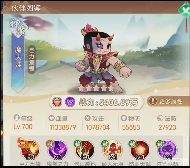 巨力恐慑:对敌方前排全部目标造成攻击力80%的物理伤害,并有30%概率对受击目标造成【恐慑】效果,持续2回合。持有【恐慑】目标若当前生命值低于其最大生命值20%,则直接斩杀,成功斩杀后,魔大娃回复20%最大生命值。