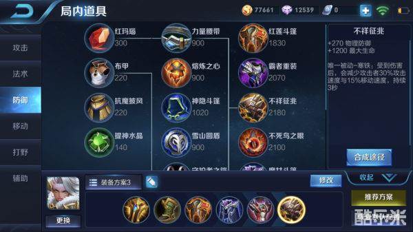 六神装备:近卫荣耀、影忍之足、红莲斗篷、魔女斗篷、反伤刺甲、不祥征兆