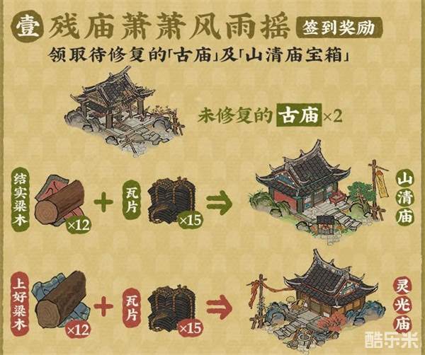 1、活动期间每日前往签到奖励-限时页面,完成签到,第1日可领取「山清庙废墟」建筑