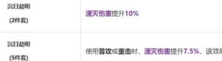 沉日劫明5件套:除了2件套的效果外,5件套还能在使用普攻或重击时,额外提供湮灭伤害提升7.5%,该效果可叠加4层,持续15秒,极大地增强了丹瑾的爆发能力。