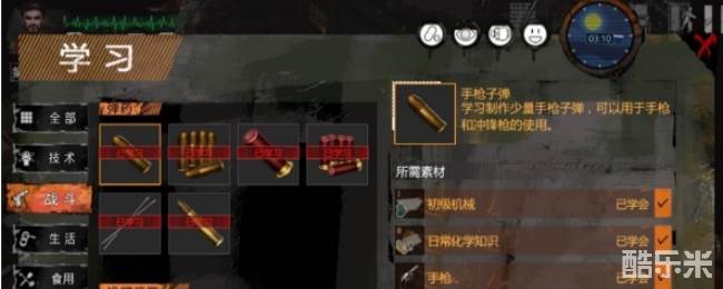 手枪子弹需要初级机械,想制作大量手枪子弹达到中级机械就可以,想要更高的枪械制作记得升级机械知识。