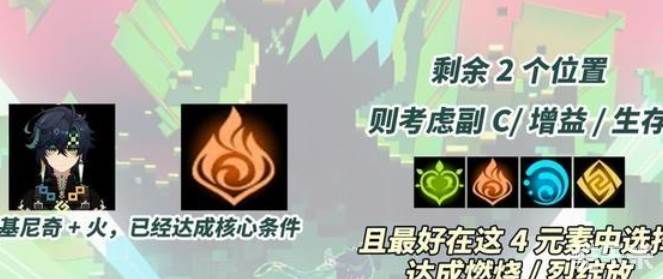 基础构建,基尼奇+稳定且随身挂火角色+草/水/火副C+增益队友。