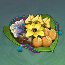 由巡林官提纳里精心挑选出的可食用菇组成。除了寻常菇类,还有从未见过的神秘品种。未经任何香料调味,反而更加凸显出菌菇本身的鲜美…如此难得的珍馐美味,一定让他花了不少研究工作以外的时间吧。