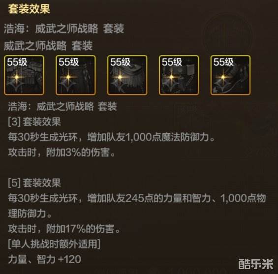 适配分析:浩海:威武之师战略套属于辅助类套装,能给队友增加12%左右的伤害,且作为漫游训练皮甲精通套装之一,在原本给队友增加输出的基础上,升级后的套装附加了队友增防效果,更利于队友在世界BOSS和降临罗特斯中生存,能够使队友得到更大的输出空间,非常受想要冲击世界boss更高排名玩家的喜爱。想要走输出+辅助类型的漫游玩家可以考虑。