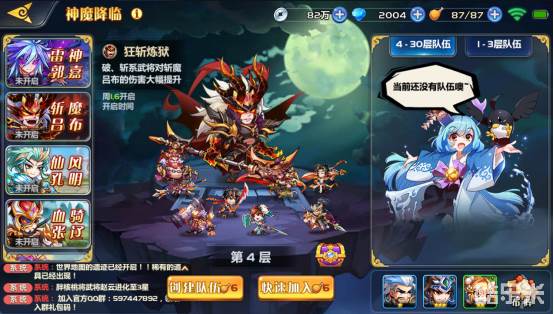 《萌将风云》神魔降临玩法可促进玩家交互,玩家在组队系统中,可跨服与其他玩家进行组队,从而一起进行战斗,战斗成功后可获得一系列奖励,奖励包括用于神魔祭坛升级所需的晶石,合成武将皮肤的碎片等等高奖励材料。