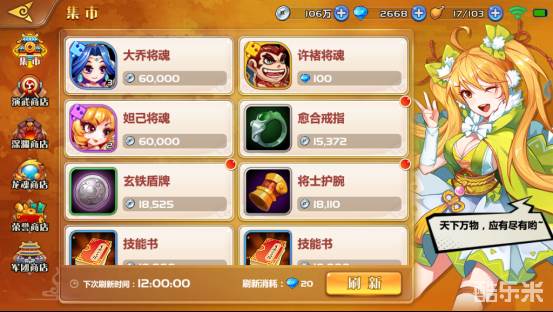 《萌将风云》中的集市因产品众多,分为集市、演武商店、深渊商店、龙魂商店、荣誉商店以及军团商店。玩家通过各种手段获得代币后,便可在其中换得武将将魂。