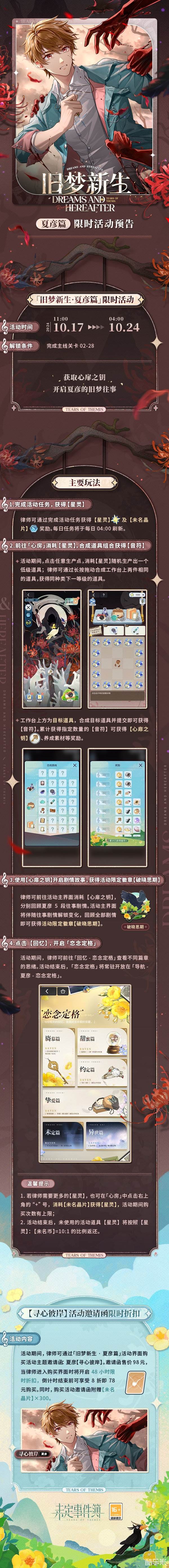 活动期间,律师合成目标道具并提交即可获得【星灵】。累计获得指定数量的【星灵】可获得【心扉之钥】、养成素材等奖励。获得【心扉之钥】后,可前往活动主界面消耗【心扉之钥】,分别回顾夏彦5段往事剧情。活动主界面将伴随往事剧情变化,回顾全部剧情即可获得活动限定徽章【破晓思期】