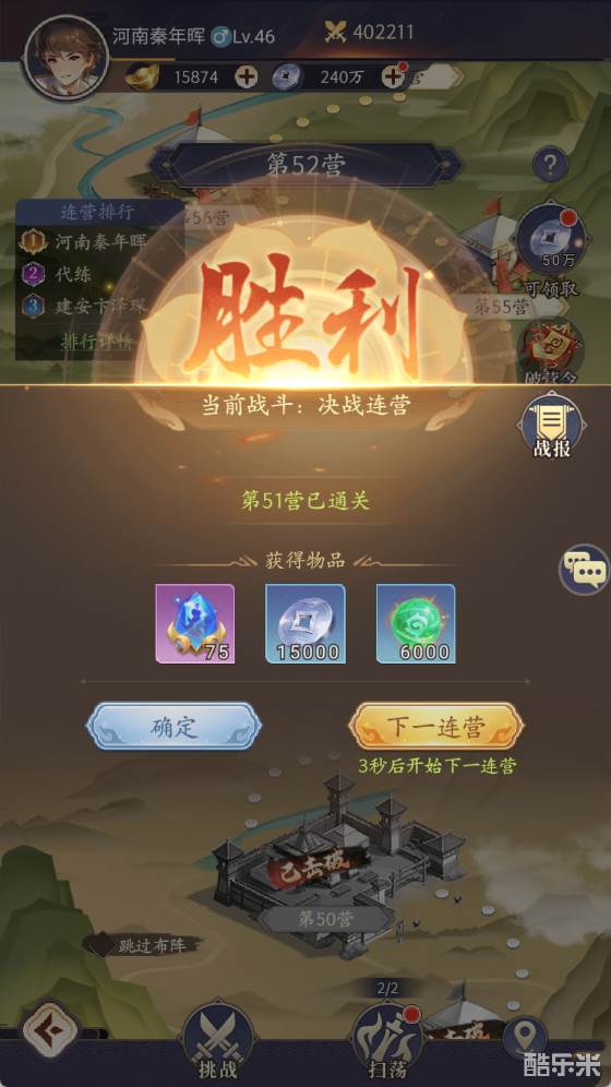 首次通关可获得大量突破石奖励,可用于武将晋升,突破等级上限,每通关10营可领取连营进度奖励。