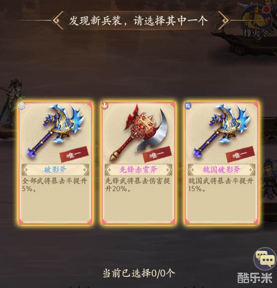 探索战船后将获得兵装,兵装能够为当前阵容的武将带来多样的加成效果,仅在铁索连环中生效。种类分为全体生效、属性生效(魏、蜀、吴、圣、魔)、职业生效(先锋、辅助、策士、铁卫)、单独生效(仅针对单独武将生效)。