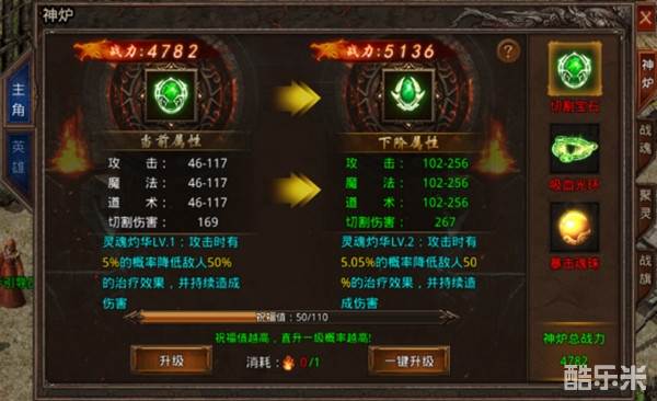 玩法介绍:对神炉进行升级,获得大量属性,如果升级失败会获得祝福值,祝福值越高神炉升级概率越高,法宝同时到达一定等级后可以激活一个阵法特效,法宝等级升级后阵法特效也会随之变化。