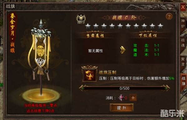玩法介绍:战旗可获得属性及战旗压制(压制等级高于目标,伤害额外增加5%),通过消耗远古战意(来源远古禁地)提升战旗等级,每升一星战旗压制都会提升一级,战旗等级全服第1,第2,第3,第4~10的玩家可额外获得5%,4%,3%,1%的神威伤害。